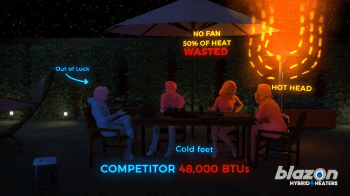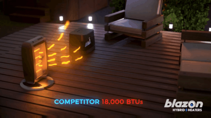 We overcome this challenge by making a heater you can safely place on the floor and by integrating a powerful fan with a 6 foot range that heats you and your guests from the feet upward. This allows you to run the Blazon Ember Hybrid at a lower heat setting and feel the same amount of heat as traditional heaters at higher heat settings.