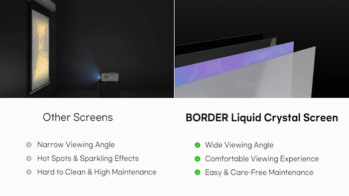 BORDER REEN-X is a revolutionary projector screen that uses the same Liquid Crystal Display technology for TVs to enhance picture quality. The Liquid Crystal Screen enhances picture brightness, offers accurate color fidelity, and improves contrast levels.