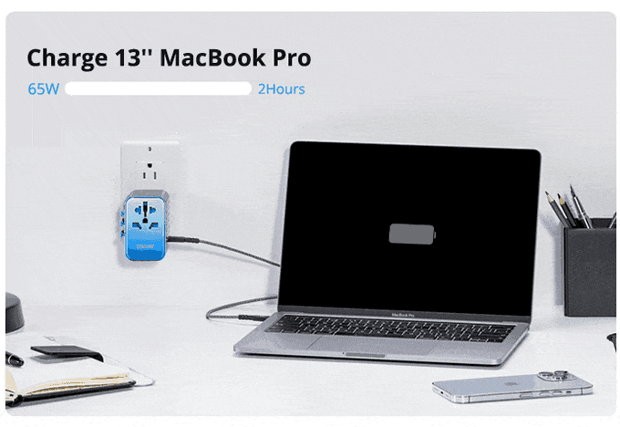 This is our most powerful Passport ever. You can easily charge your 13 inches MacBook Pro in just 2 hours, and charge your iPhone to 50% in under 30 minutes, without any bulky proprietary chargers. That’s because Passport III uses best-in-class Navitas Gallium Nitride (GaN) semiconductors.