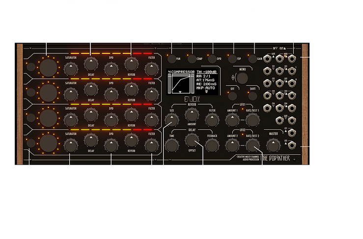 - Led bar indicator for audio feedback, VU-Meter, gain reduction compressor, lfo, Double pulse position, pan and stereo opening